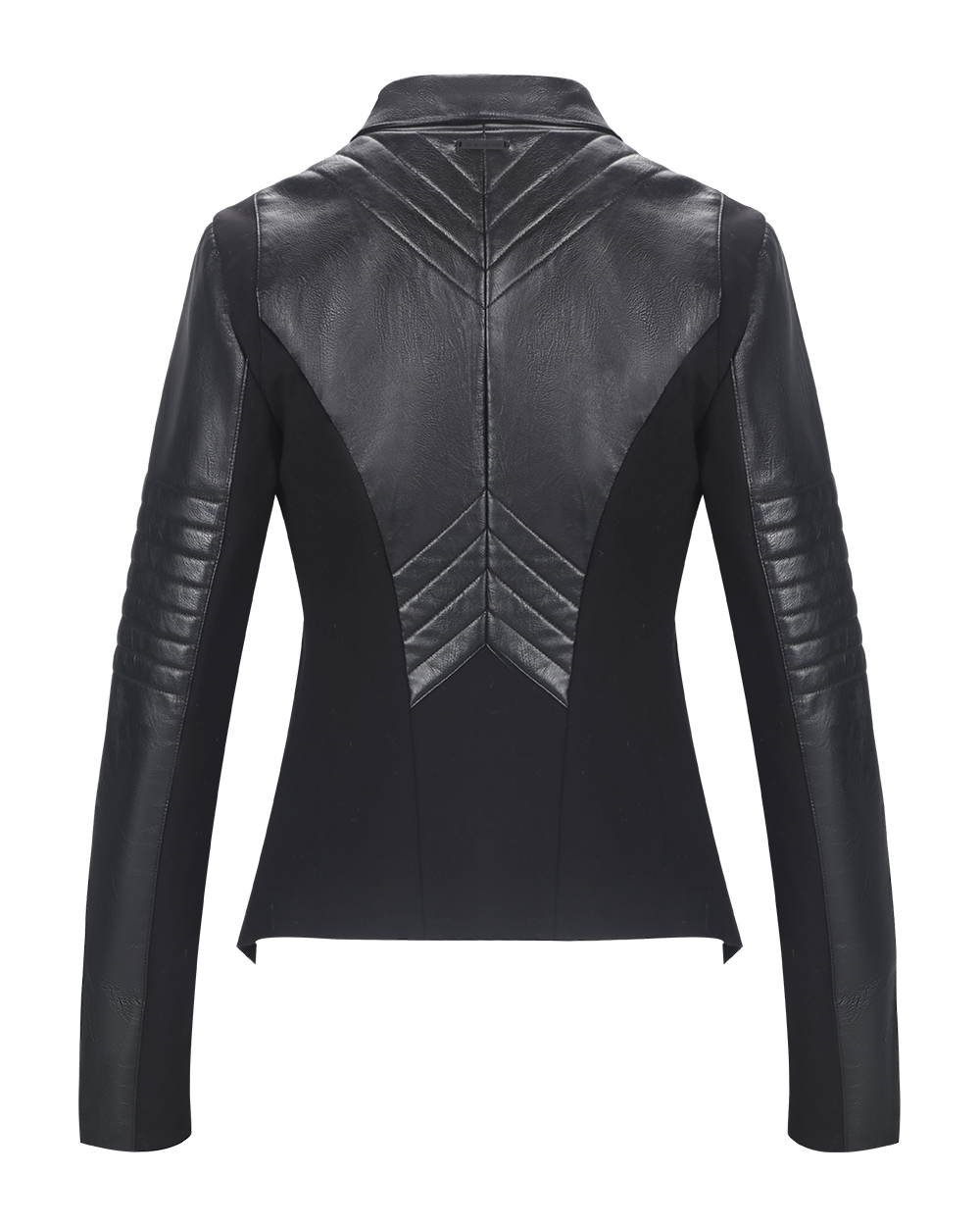 Ladies’ PU blend kntting jacket Shell1:100%PU+100%Rayon Shell2:85%Polyester,15%Spandex Lining:100%polyester Details:PU blend knitting fabric Side pockets with 5#metal zippers at front V stitch design at back Suggested color:Black,White,Brown