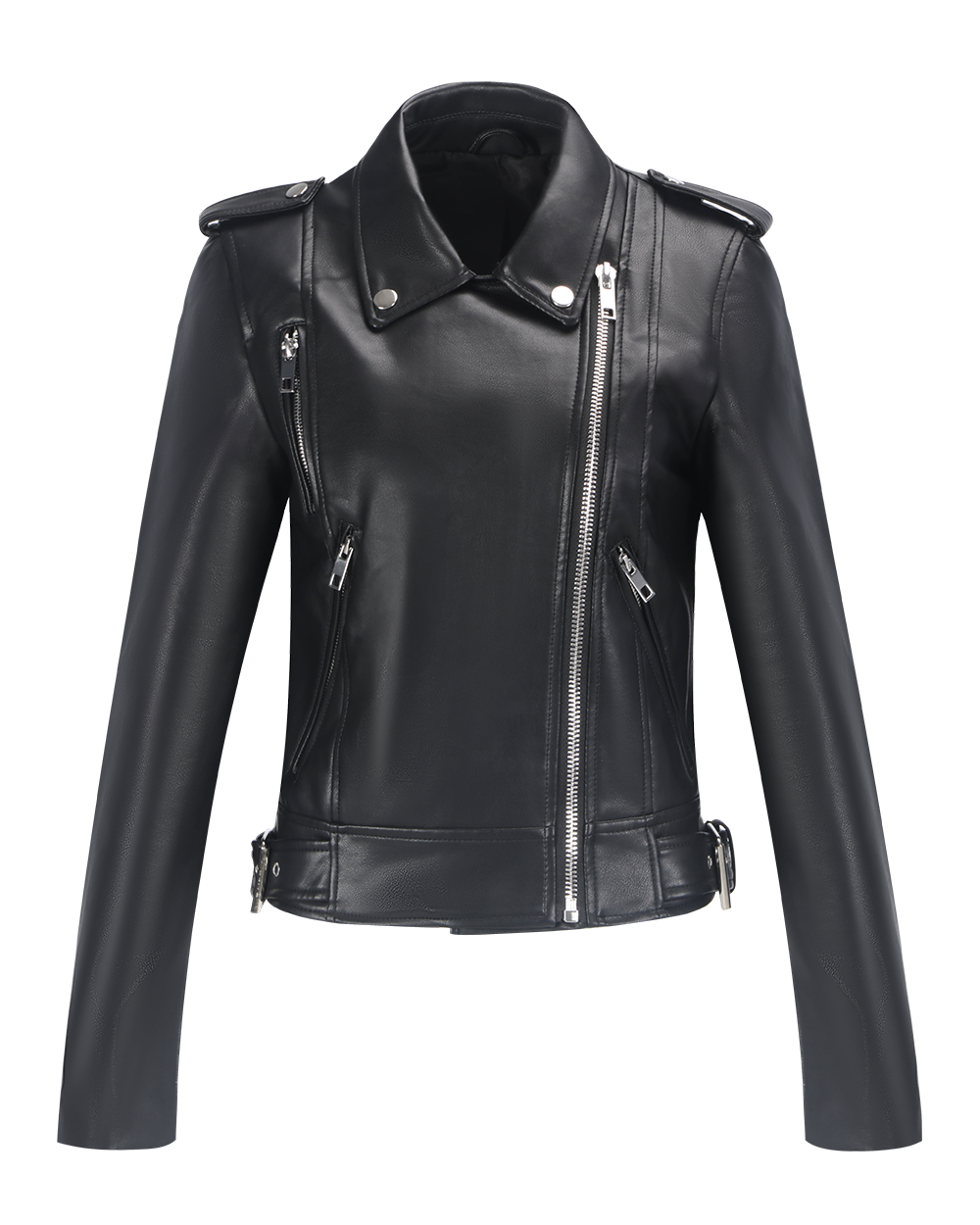 Ladies’ PU jacket Shell:PU+86%Polyester,14%Cotton Lining:100%Polyester taffeta Details:8#Metal zipper at front Real pockets with 5#Metal zippers at bottom Fake pocket with 5#Metal zipper at right chest 5#Metal zippers at sleeve cuffs Snap buttons at collar tips,lapel tips and shoulder Hooks and eyelets at bottom Suggested color:Black,Brown,Cream