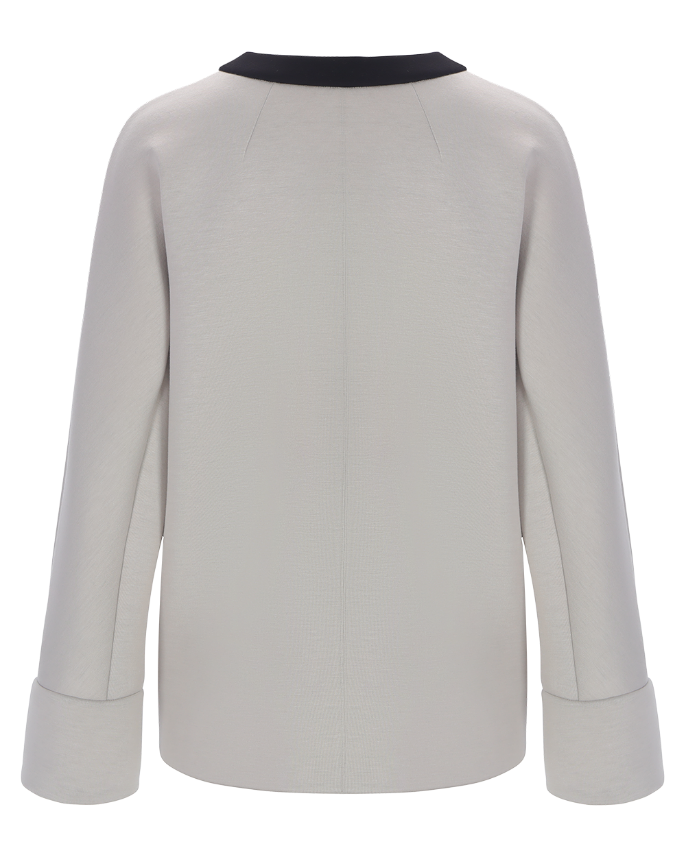 Ladies’ jersey bonded jacket Shell:96%Rayon,4%Spandex Lining:No lining Details:Contrast color with Self fabric at front,collar and pocket opening Metal button with sefl fabric cover at front No lining,seam locked and piped inside with self jersey fabric Two big attached pockets without flaps at bottom Suggested color:Cream/Black,Dark Grey/Black,Blue/Black