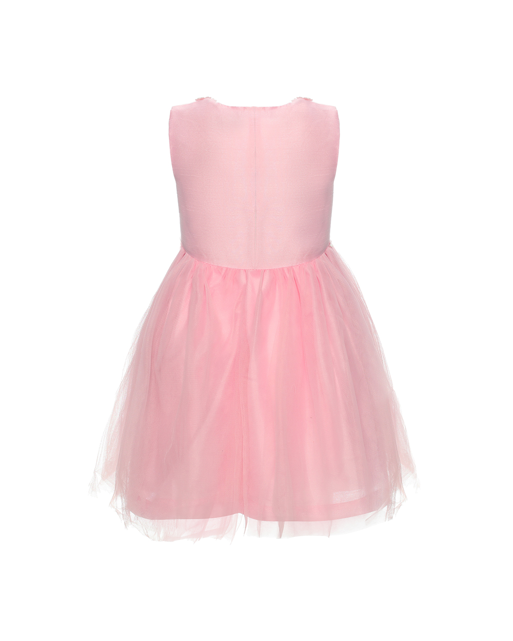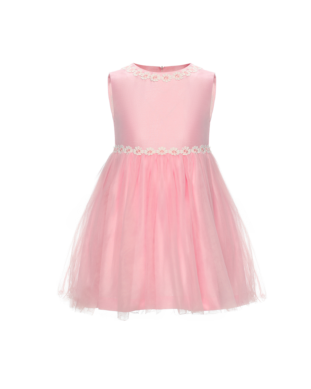 Children’s sleeveless dress Shell1:100%polyester Shell2:100%polyester Mesh:100%polyester Lining:100%Polyester Details:Invisible zipper at center back Lace at collar and waist Wide dress bottom Suggested color:Pink,Cream,Light Blue