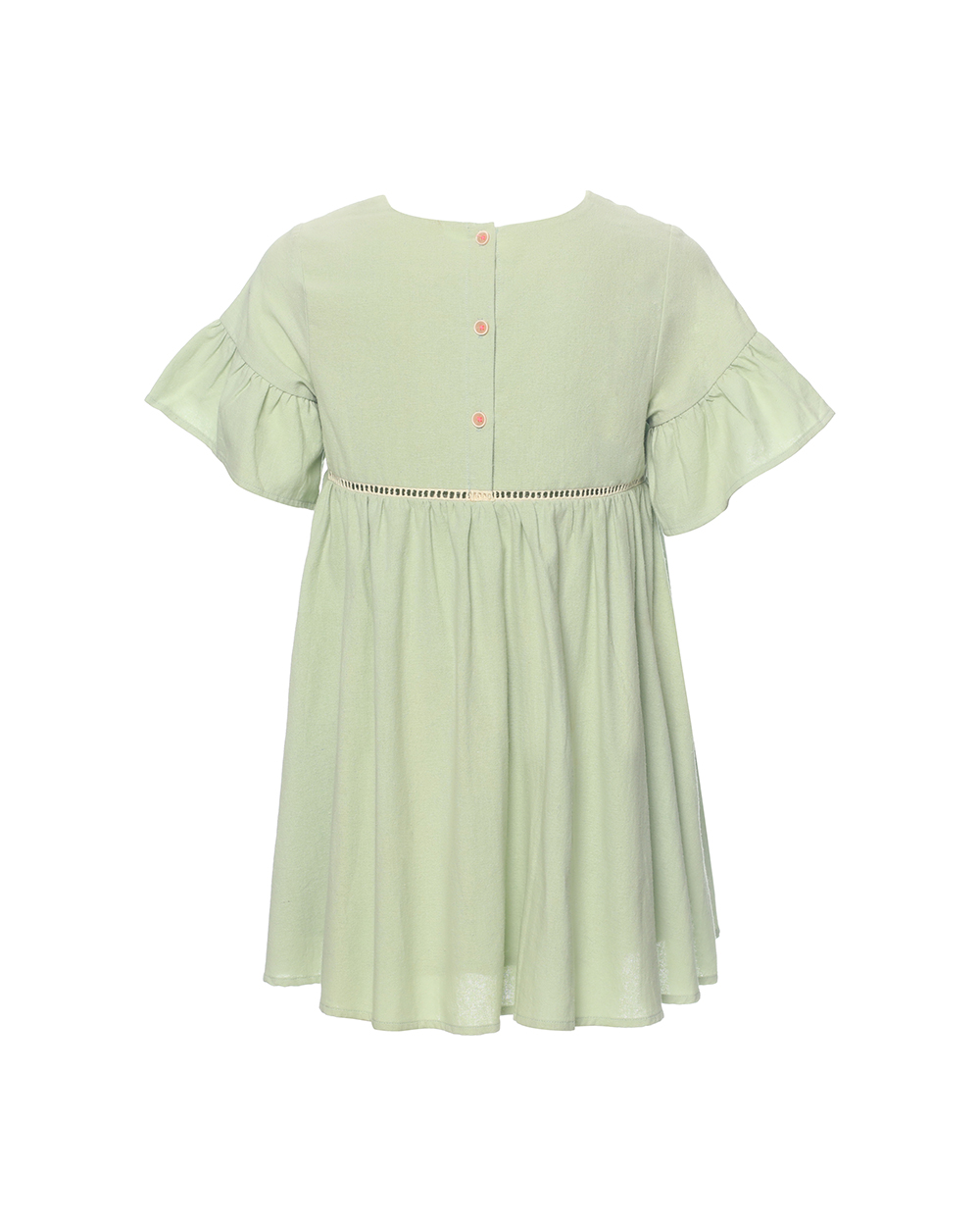 Children’s short sleeve lace dress Shell:100%Cotton Lining:100%Cotton Details:Flower embrodery at front chest Cord with fringle at collar edge Lace at waist and pockets opening Small button at center back Suggested color:Grass Green,Cream,Light Blue,Light Pink