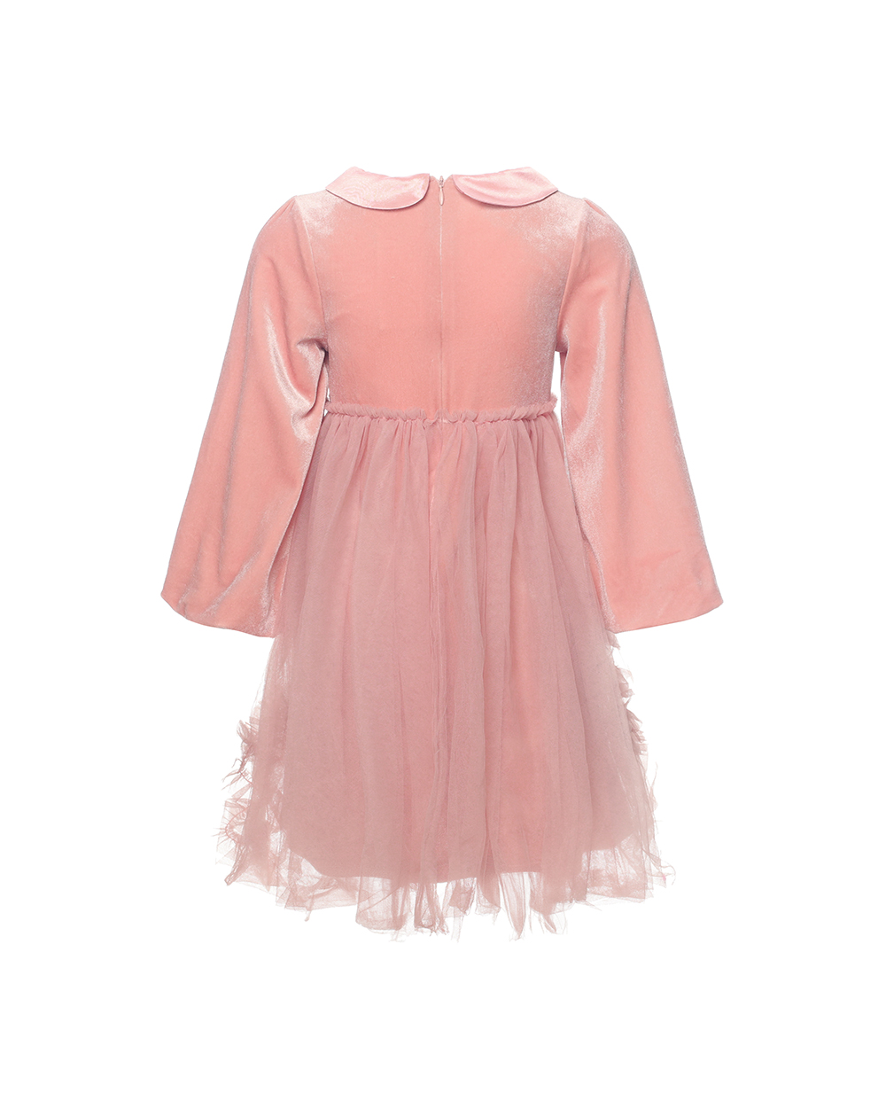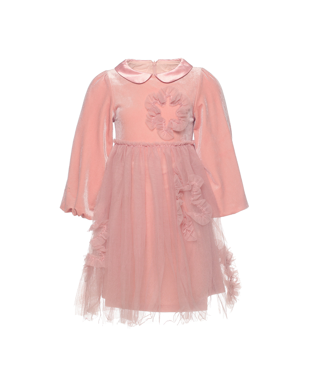 Children’s princess dress Shell:92%Polyester,8%Spandex Mesh:100%Nylon Lining:100%Cotton Details:Mesh flower at front Invisible zipper at center back Thin elstic band at cuff Wide dress bottom Suggested color:Pink,Blue,Navy