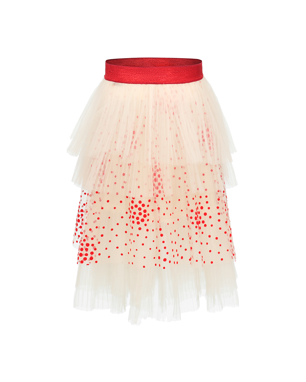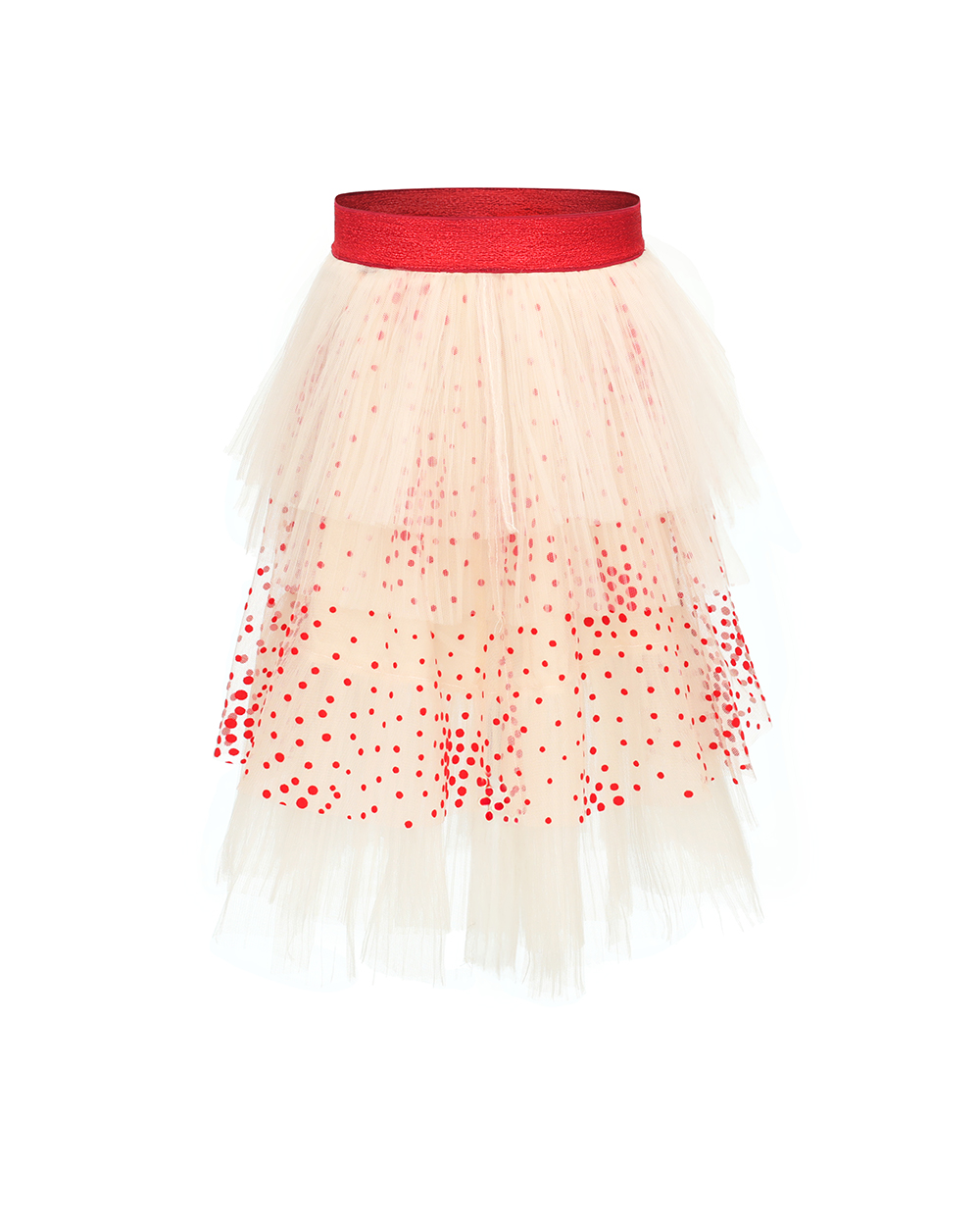 Children’s short skirt Mesh Shell:100%polyester Lining:100%Cotton Details:Wide elastic waist band Small red circle flocking printing Five layers design Suggested color:Cream,Navy