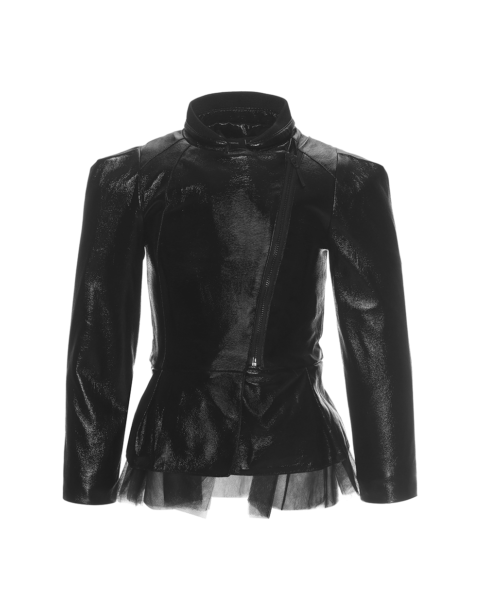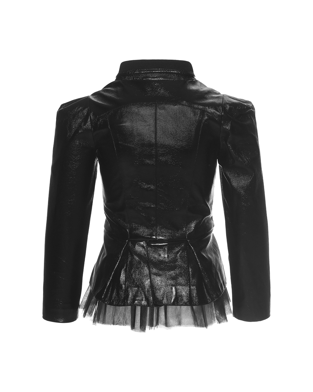Childrens’ PU jacket Shell1:Thin PU Shell2:100%Polyester mesh Lining:100%Cotton Details:3# metal zipper at left chest Pleats at bottom 1X1 rib at collar Detachable mesh bottom with 3# metal zipper Suggested color:Black,Pink,Grey