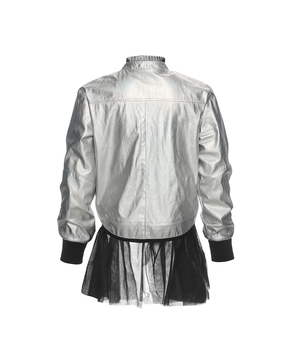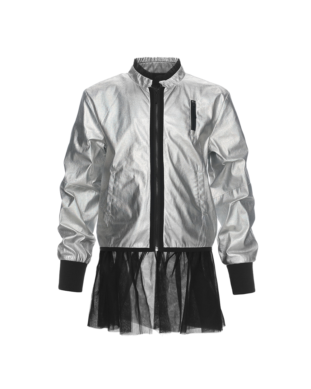 Childrens’ PU jacket Shell1:Thin PU Shell2:100%Polyester mesh Lining:100%Polyester Details:Mesh trim at collar 3# metal zipper at front 3# metal zipper at left chest fake pocket Two side pockets without flap 1X1 rib at cuff Detachable mesh bottom with 3# metal zipper Suggested color:Silver,Black,Grey