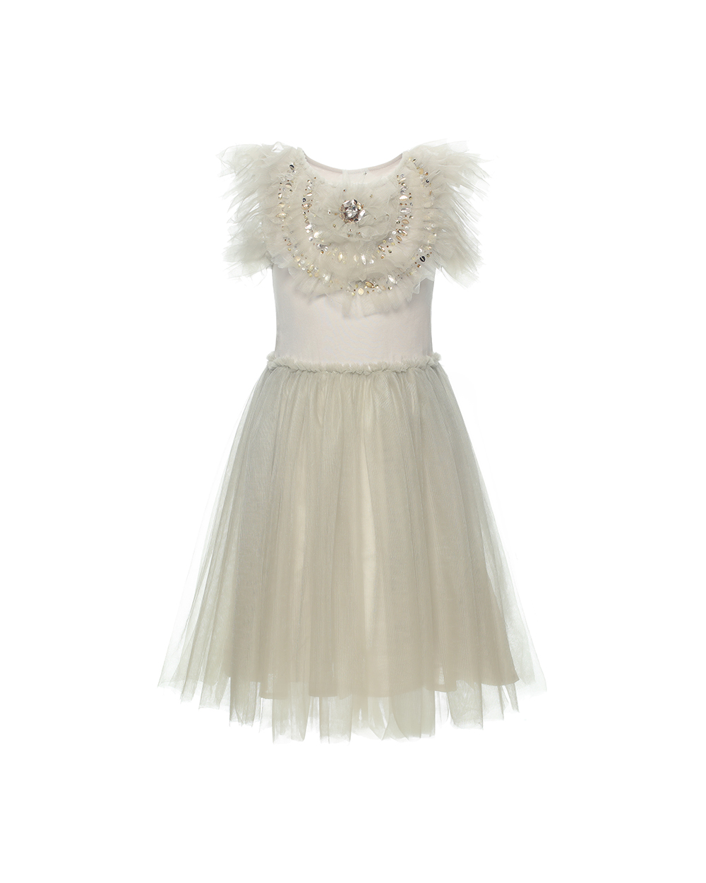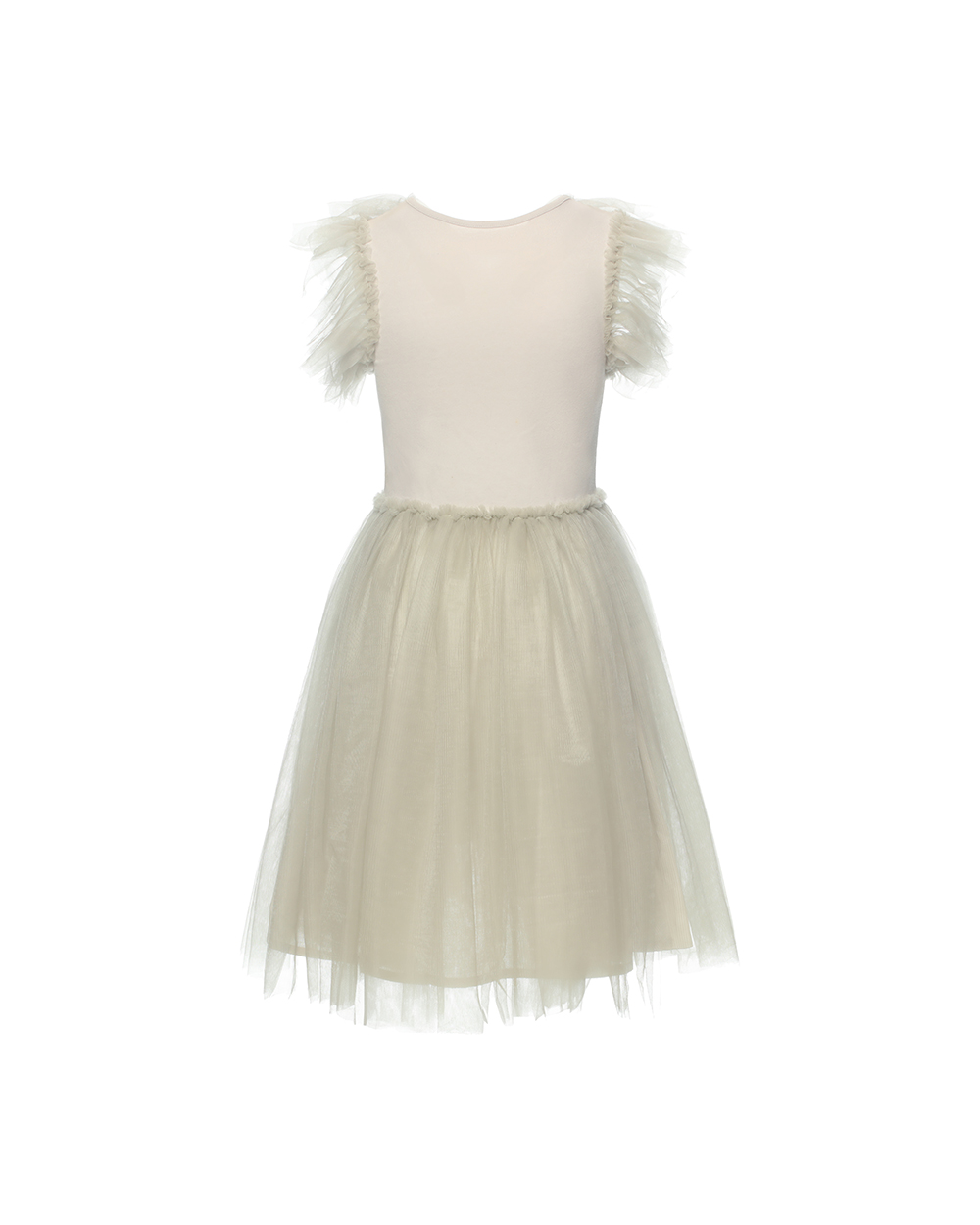 Children’s princess dress Shell:100%Cotton jersey Mesh Shell:100%Nylon Lining:100%Cotton Details:Mesh flower trim at front Mesh trims at armholes and bottom Wide dress bottom Suggested color:White/Grey