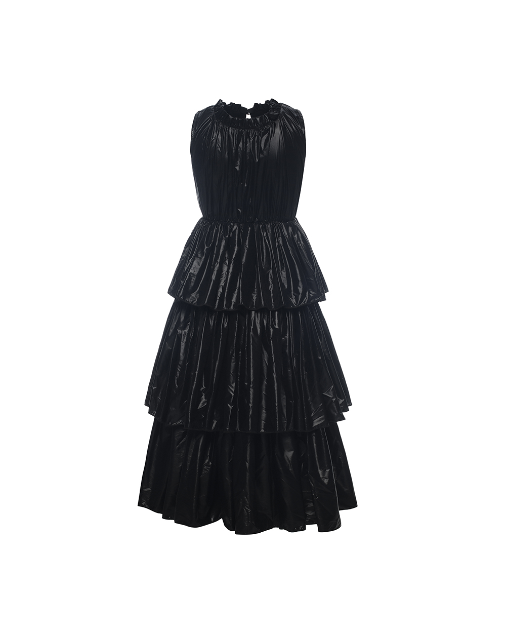 Children’s sleeveless long dress Shell:100%Nylon Lining:100%Cotton jersey Details:Slit at center back with small button Wide bottom Body with three wave layers Suggested color:Black,Pink,Blue