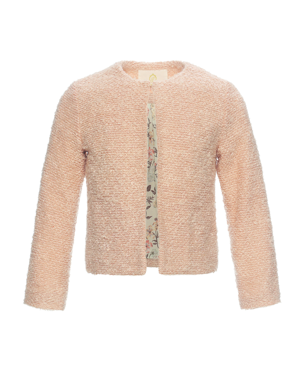 Children’s Tweed jacket Shell:50%Polyester,35%Wool,15%Viscose Body Lining:100%Cotton Sleeve Lining:100%Polyester taffeta Details:Small hook at front Suggested color:Pink,Blue,Cream