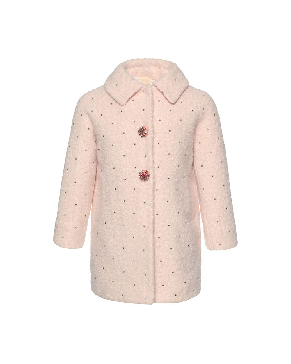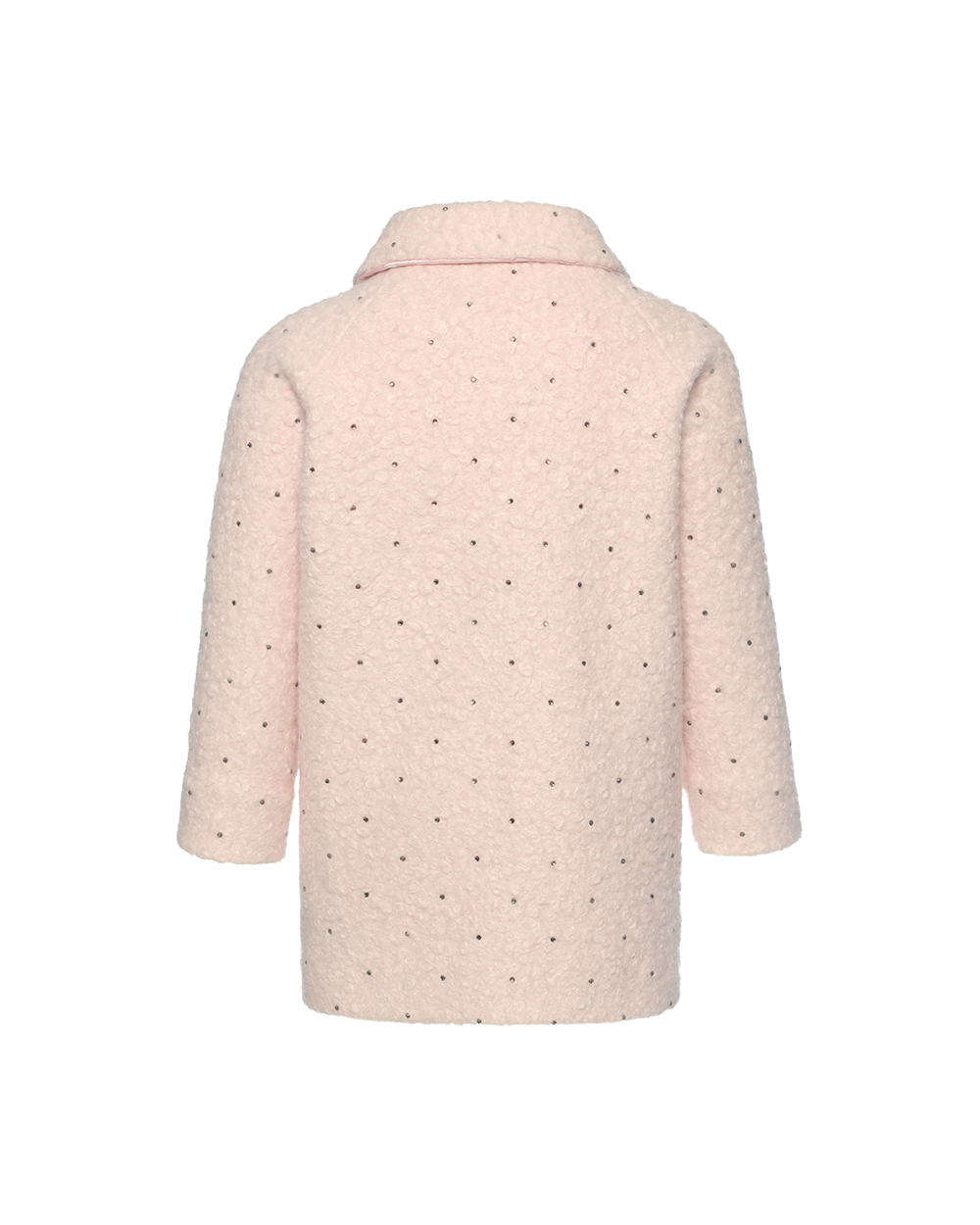Children’s faux short fur jacket Shell:100%polyester Lining:100%Polyester Satin Details:Small diamonds allover the body and sleeves Big snap buttons at front placket with big diamond trims Two side pockets without flap Suggested color:Pink,Blue,Black