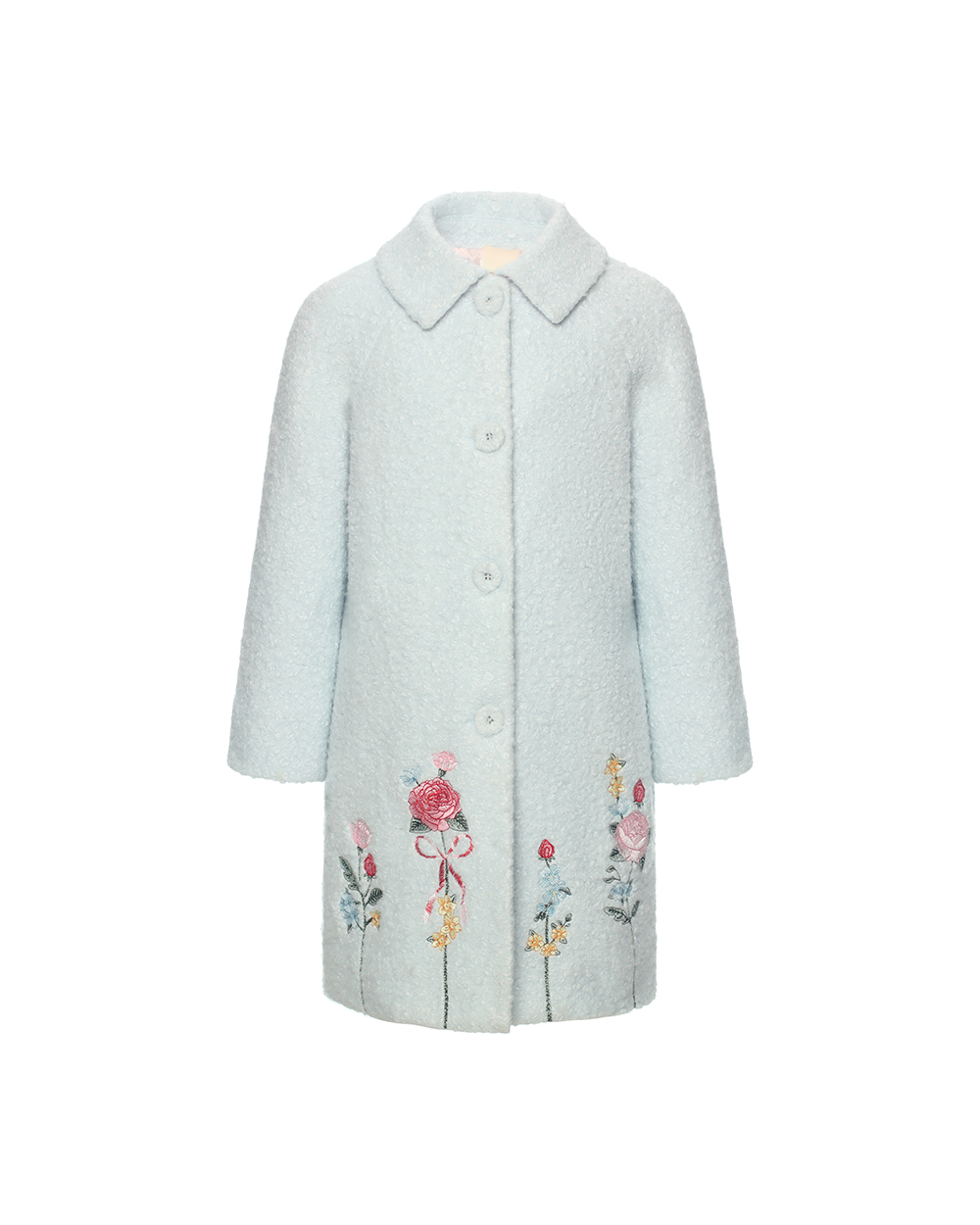 Children’s faux short fur jacket Shell:100%polyester Lining:100%Polyester Taffeta Details:Flower embrodery at the whole buttom Flower embrodery at cuff Buttons with cover shell fabric at front placket Suggested color:Blue,Pink,Green
