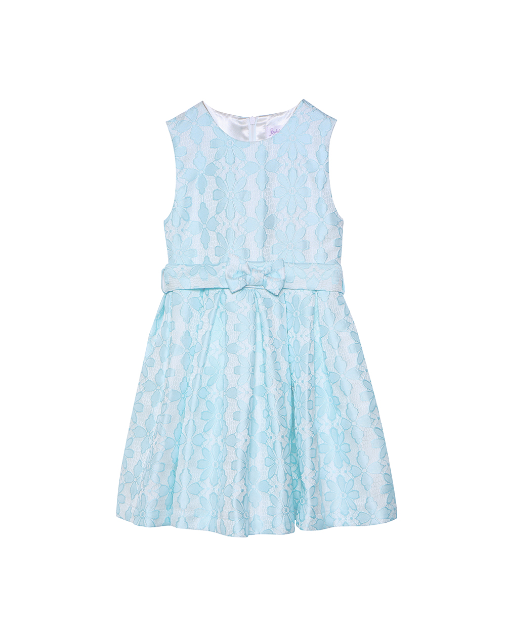 Children’s sleeveless dress Shell:100%Polyester with jacquard flower Lining:100%Polyester satin Details:Flower jacquard fabric Bowknot trim on belt at waist Invisible zipper at center back Suggested color:Light Blue,Navy,Pink